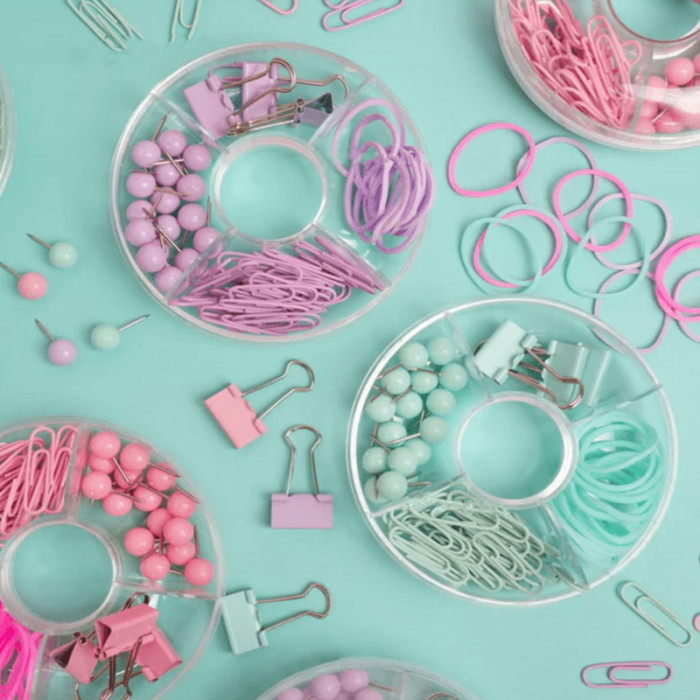 • VALUE PACKAGE. Each pack comes with 4 x Binder Clip, 20 x Push Pins, 20 x Ball Pins, 15 x Rubber Band . Round for case packed for easier storage and use.