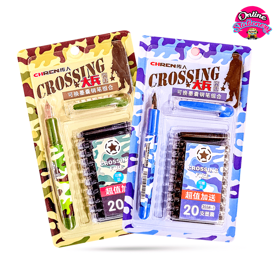 CHREN Cute Army Fountain Pen With 20 Ink Refill CR-3701. CHREN army design crossing fountain pen. Chren fountain pen for Girls & Boys. Pen tip: 1 EF large tip. 1pcs x 3.4mm Fountain pen. 20pcs x Erasable blue ink.