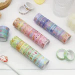This Fantasy Washi Tape Set includes sixty individual tapes with unique, vibrant designs. Each tape showcases a range of colors, patterns, and textures to meet all creative needs.