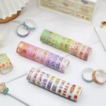 This Fantasy Washi Tape Set includes sixty individual tapes with unique, vibrant designs. Each tape showcases a range of colors, patterns, and textures to meet all creative needs.