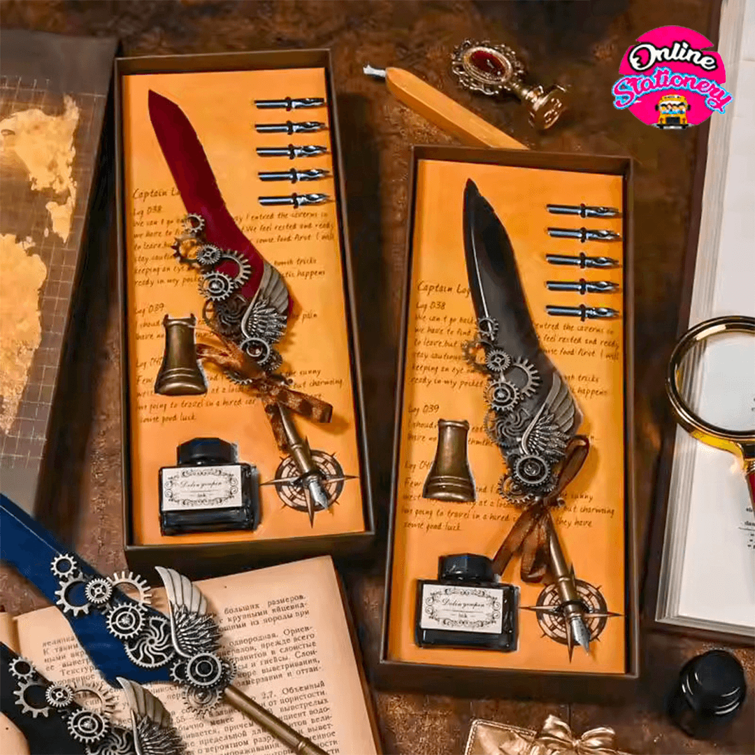 You can buy this Luxury Vintage Calligraphy Feather Dip Pen Set online in Pakistan with complete confidence from onlinestationeryshop.pk. We offer nationwide delivery across Pakistan, ensuring your order reaches you safely and on time. Add a touch of sophistication to your writing tools and enjoy a timeless writing experience.