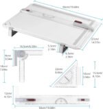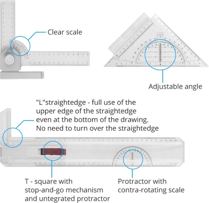 T-Square & Triangle: The T-Square straight edge slides up and down on a plastic runner, and holds a nice 90° angle, and can be locked in position on either side of the board. With a 4.7″ swivel ruler and a 4.7″ angled triangle, slide into a slot in the T-square, making it very easy to move back and forth.
