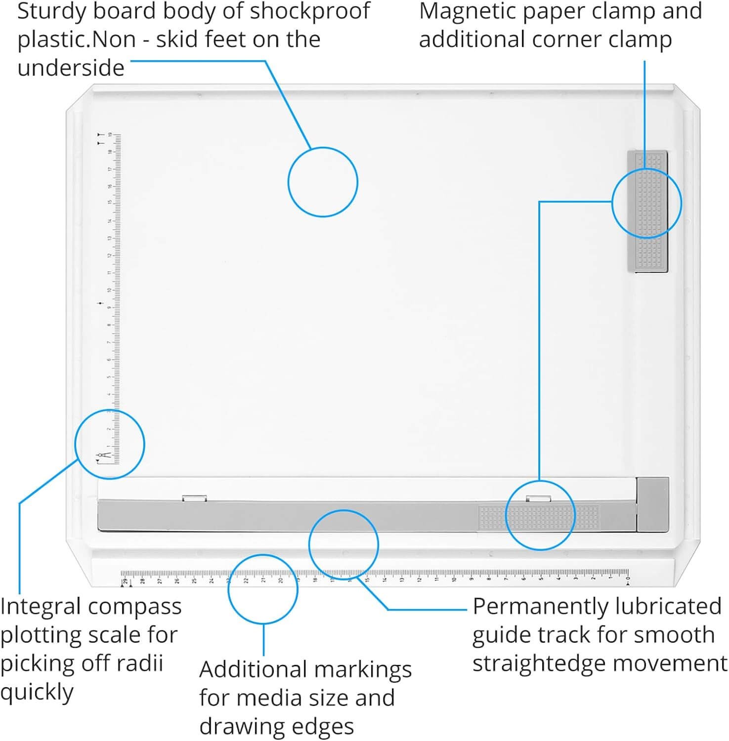 - A drawing board made of unbreakable plastic for long durability.