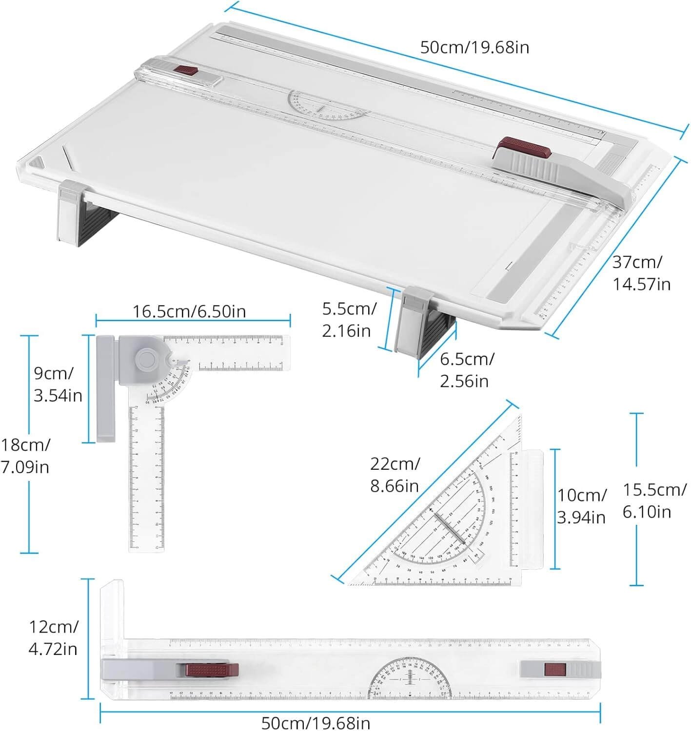 - A3 folder for your drawings, 2 feet for 2 different angles of inclination, angle rulers, parallel drawing rail with 2-point guide for smooth gliding and a triangle!
