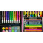 - 86 Pieces Painting Set. 12 Crayon. 12 Color Pencils. 12 Wax Stick. 24 watercolor Pens. 1 Long Lead. 1 Sharpener. 1 Eraser. 1 Glue. 1 Scissor. 1 Ruler. 1 Paint Brush. 1 palette. 5 Paper Clips. Made In China.