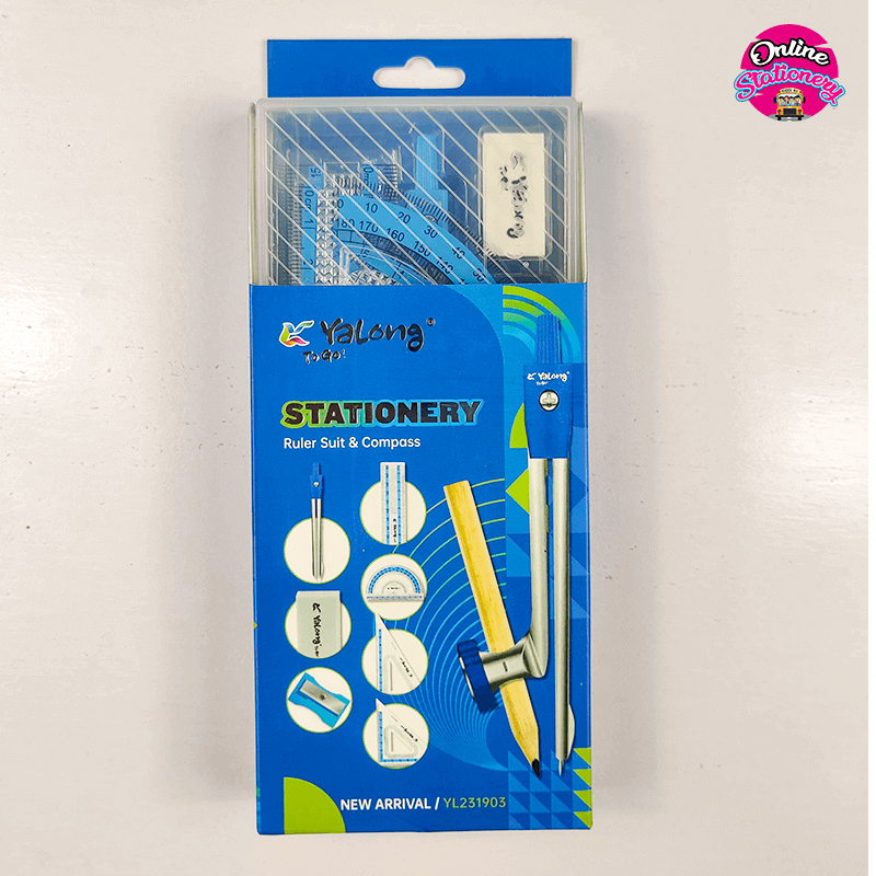 Yalong High Quality Students Compass Sets 8 In One With Ruler Advanced Drawing Tools Set. Four rulers, a compass, a pencil sharpener, and an eraser. The scale is clear, accurate, simple, and universal. With high-quality materials, the screws can adjust the tightness smoothly. The scale is clear, accurate, simple, and universal. Made in China.